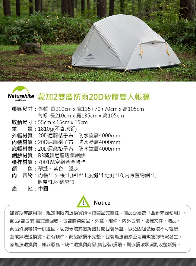 【Naturehike】蒙加2雙層防雨20D矽膠雙人帳篷_贈地席(紫色) 評價