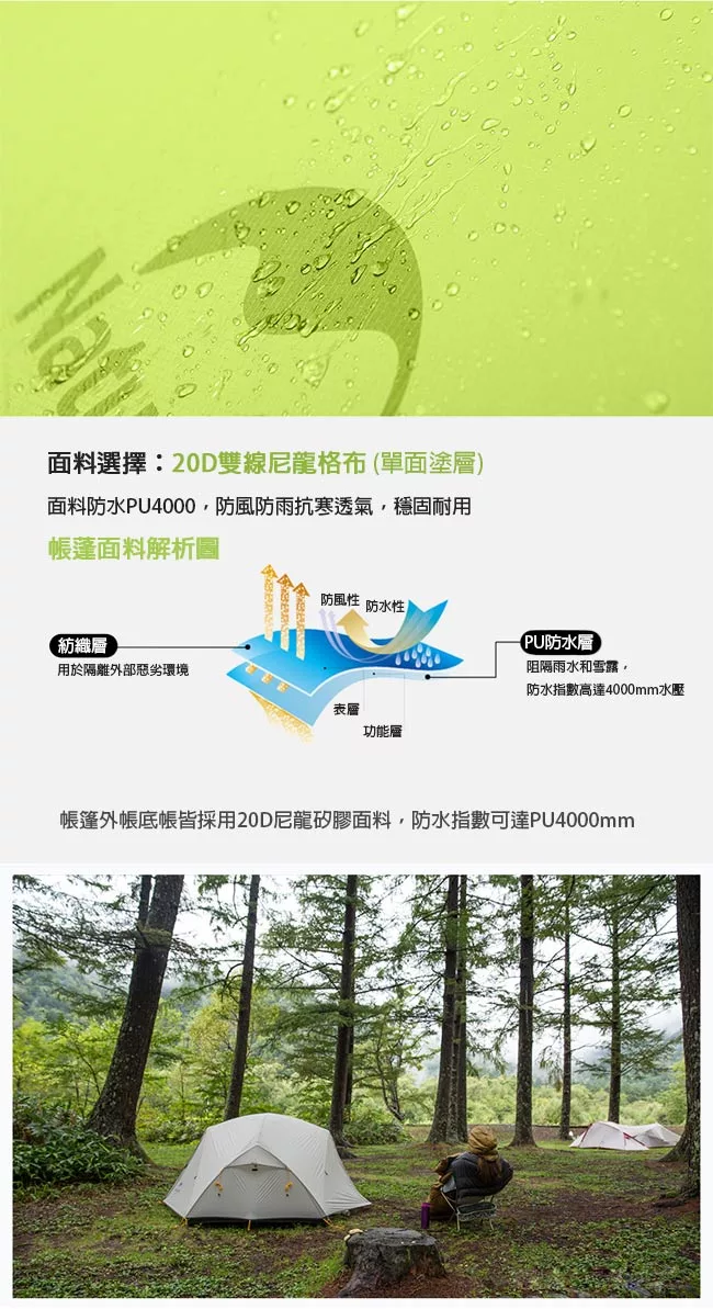 20D矽膠塗層,防雨抗風抗UV單人也可輕鬆搭建